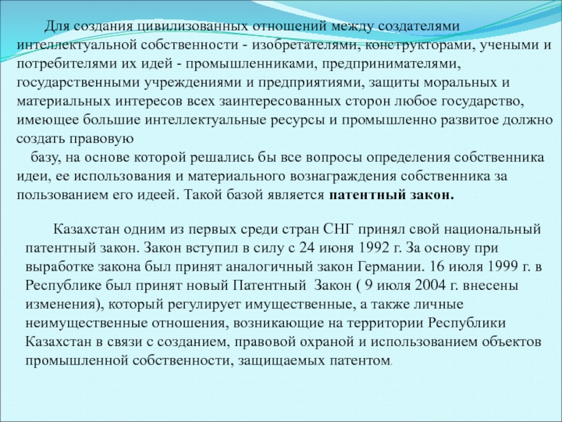 Казахстан одним из первых среди стран СНГ принял свой национальный патентный закон. Закон вступил в силу с 24 июня 1992 г. За основу при выработке закона был принят аналогичный закон Германии. 16 июля 1999 г. в Республике был принят новый Патентный Закон ( 9 июля 2004 г. внесены изменения), который регулирует имущественные, а также личные неимущественные отношения, возникающие на территории Республики Казахстан в связи с созданием, правовой охраной и использованием объектов промышленной собственности, защищаемых патентом.