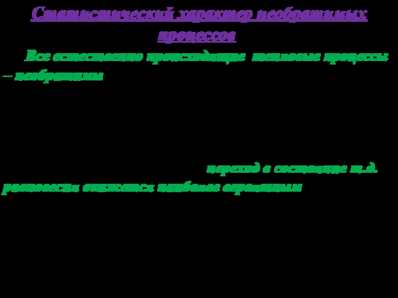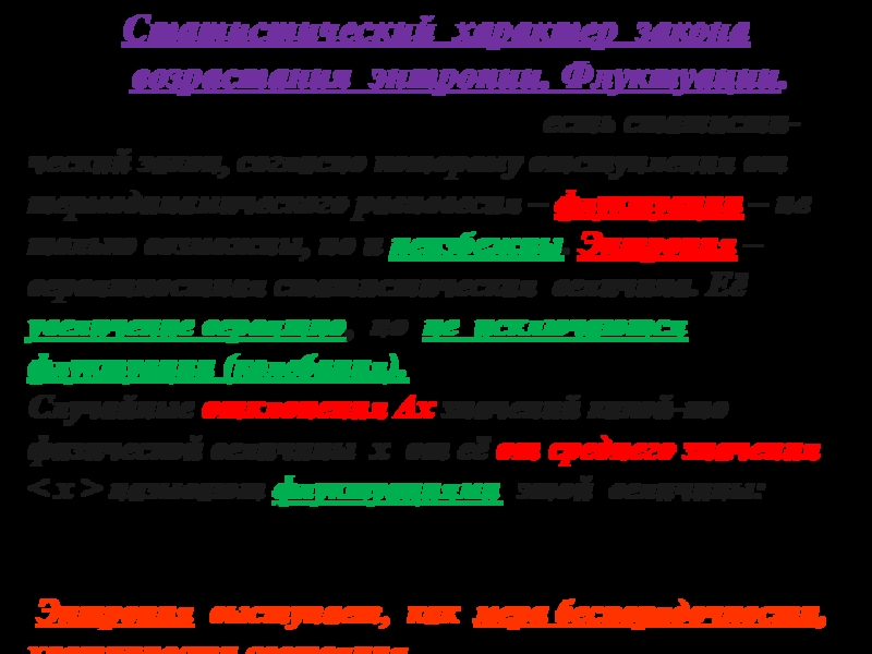 термодинамического равновесия – флуктуации – не только возможны, но и неизбежны. Энтропия – вероятностная статистическая величина. Её увеличение вероятно, но не исключаются флуктуации (колебания).