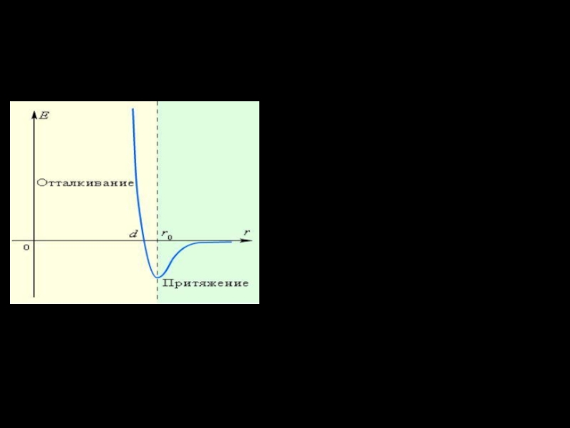 имеет минимум при r = r0. При r > r0 действует сила притяжения, при r < r0 - сила отталкивания (как будто молекулы соединены пружиной, имеющей в
