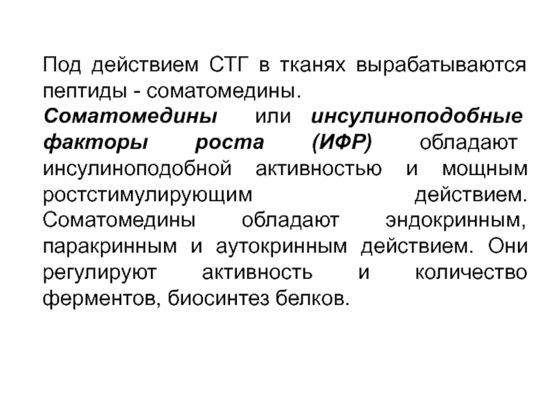 ростстимулирующим действием. Соматомедины обладают эндокринным, паракринным и аутокринным действием. Они регулируют активность и количество ферментов, биосинтез белков.