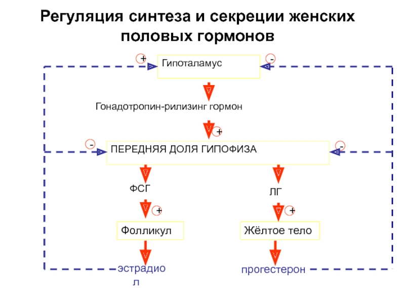 Слайд 81Регуляция синтеза и секреции женских половых гормонов