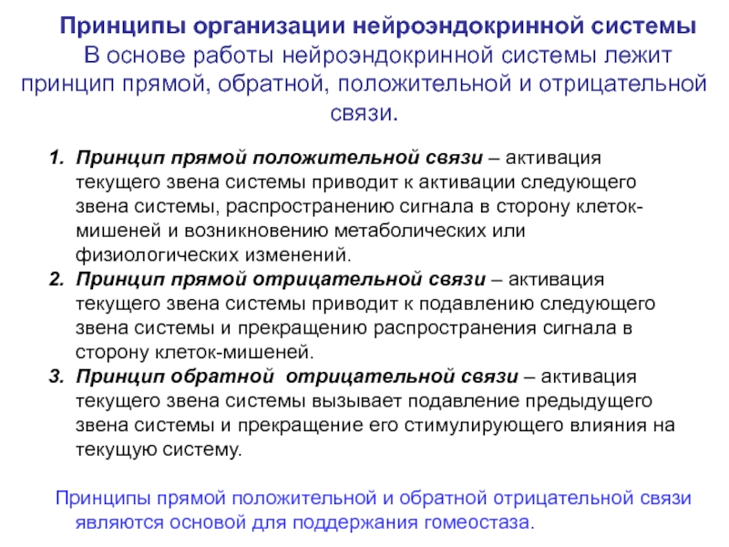 Принцип обратной отрицательной связи – активация текущего звена системы вызывает подавление предыдущего звена системы и прекращение его стимулирующего влияния на текущую систему.
