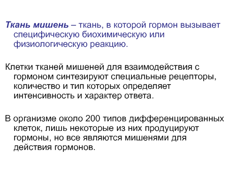 Слайд 12Ткань мишень – ткань, в которой гормон вызывает специфическую биохимическую