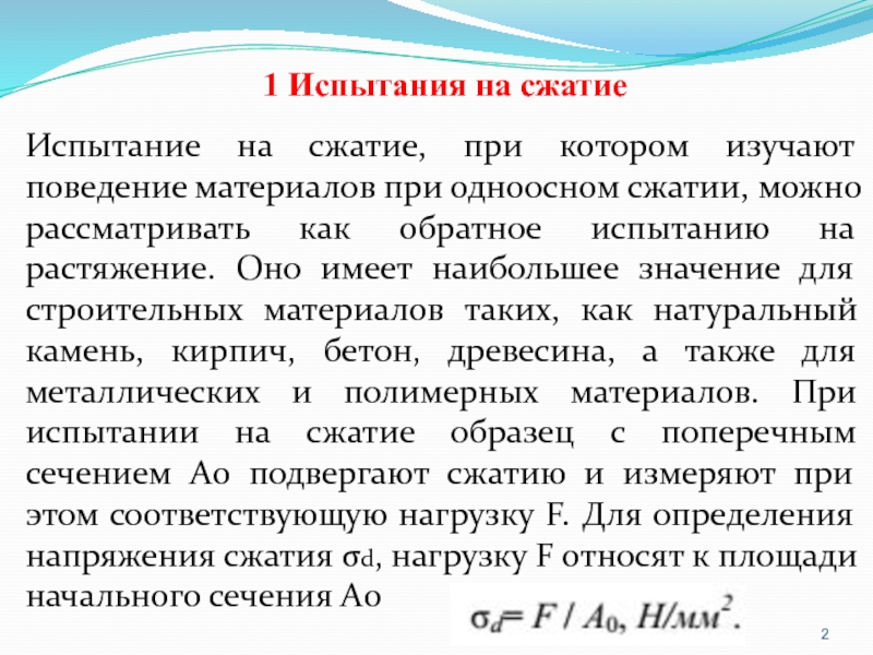 растяжение. Оно имеет наибольшее значение для строительных материалов таких, как натуральный камень, кирпич, бетон, древесина, а также для металлических и полимерных материалов. При испытании на сжатие образец с поперечным сечением А0 подвергают сжатию и измеряют при этом соответствующую нагрузку F. Для определения напряжения сжатия σd, нагрузку F относят к площади начального сечения А0