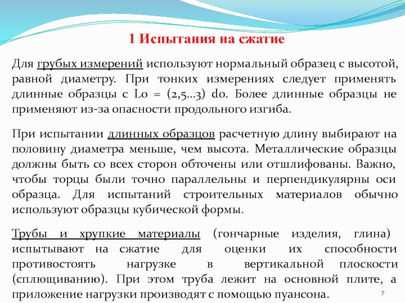 При испытании длинных образцов расчетную длину выбирают на половину диаметра меньше, чем высота. Металлические образцы должны быть со всех сторон обточены или отшлифованы. Важно, чтобы торцы были точно параллельны и перпендикулярны оси образца. Для испытаний строительных материалов обычно используют образцы кубической формы.