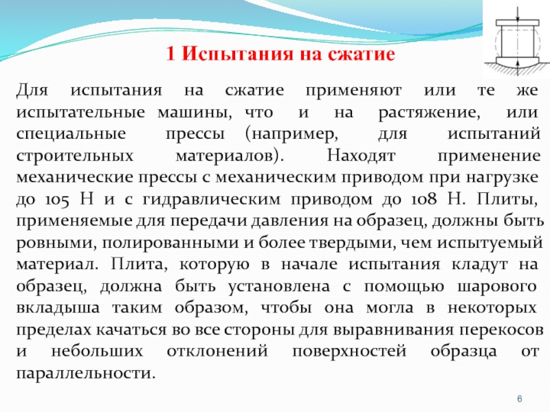 (например, для испытаний строительных материалов). Находят применение механические прессы с механическим приводом при нагрузке до 105 Н и с гидравлическим приводом до 108 Н. Плиты, применяемые для передачи давления на образец, должны быть ровными, полированными и более твердыми, чем испытуемый материал. Плита, которую в начале испытания кладут на образец, должна быть установлена с помощью шарового вкладыша таким образом, чтобы она могла в некоторых пределах качаться во все стороны для выравнивания перекосов и небольших отклонений поверхностей образца от параллельности.