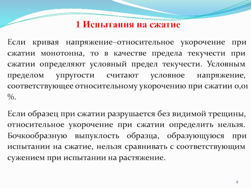 текучести. Условным пределом упругости считают условное напряжение, соответствующее относительному укорочению при сжатии 0,01 %.