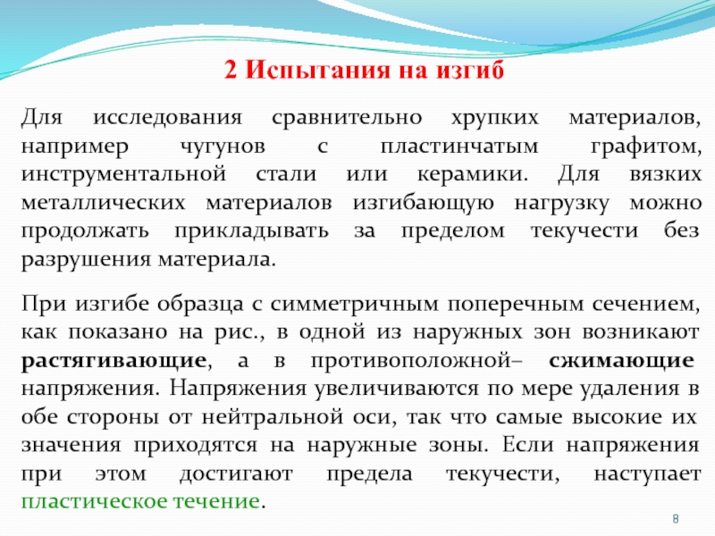 При изгибе образца с симметричным поперечным сечением, как показано на рис., в одной из наружных зон возникают растягивающие, а в противоположной– сжимающие напряжения. Напряжения увеличиваются по мере удаления в обе стороны от нейтральной оси, так что самые высокие их значения приходятся на наружные зоны. Если напряжения при этом достигают предела текучести, наступает пластическое течение.