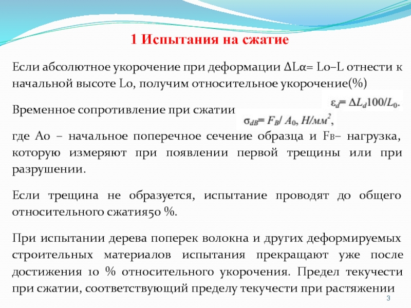 При испытании дерева поперек волокна и других деформируемых строительных материалов испытания прекращают уже после достижения 10 % относительного укорочения. Предел текучести при сжатии, соответствующий пределу текучести при растяжении