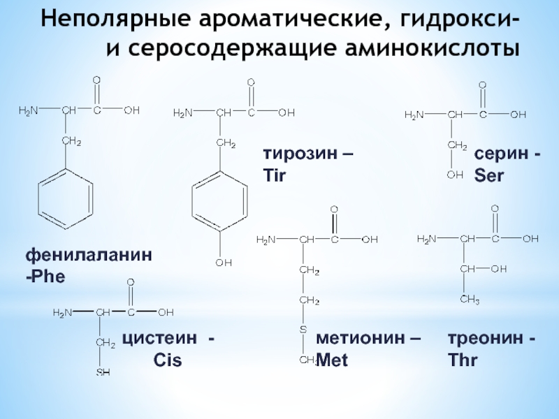 Слайд 23Неполярные ароматические, гидрокси- и серосодержащие аминокислоты