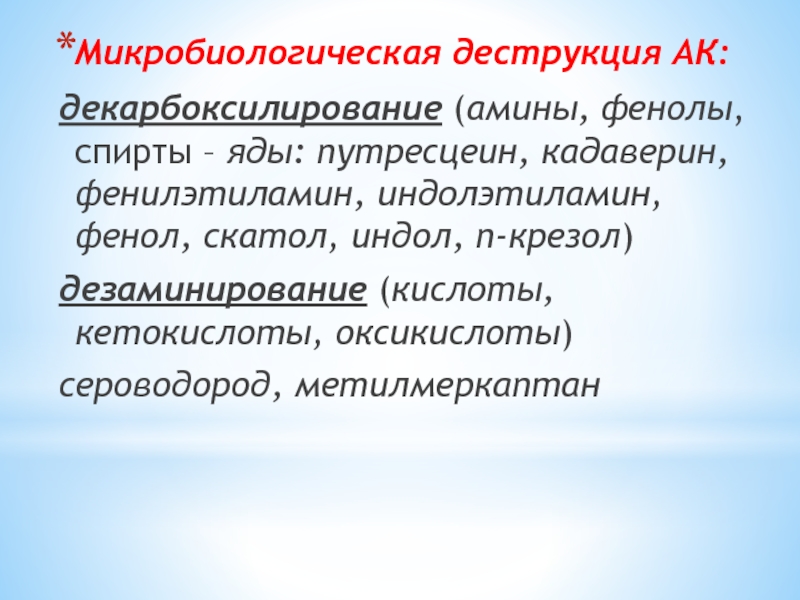 декарбоксилирование (амины, фенолы, спирты – яды: путресцеин, кадаверин,