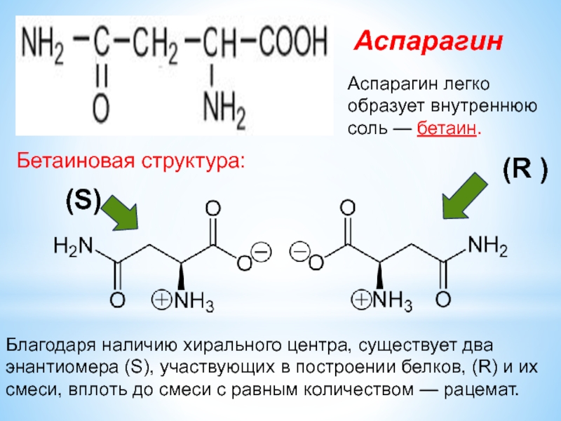 Аспарагин легко образует внутреннюю соль — бетаин.