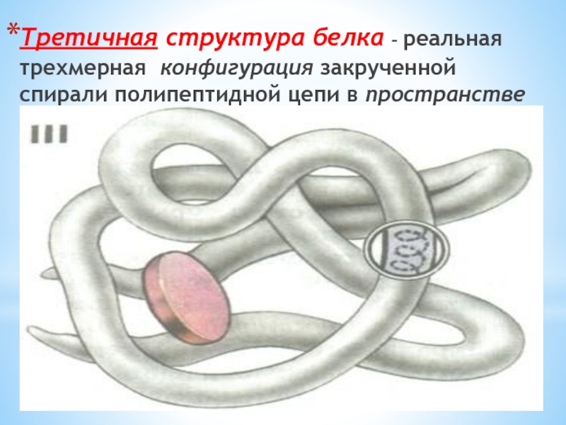 Слайд 53Третичная структура белка – реальная трехмерная конфигурация закрученной спирали полипептидной