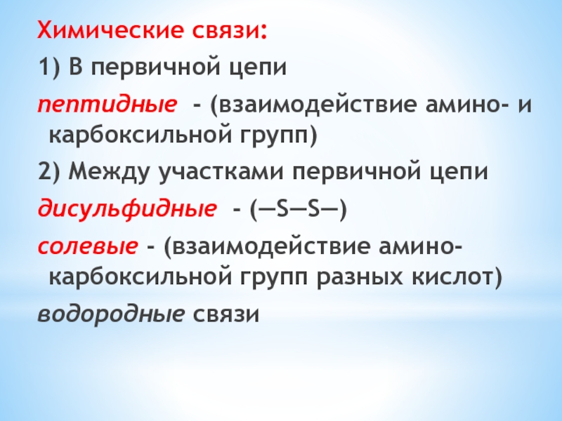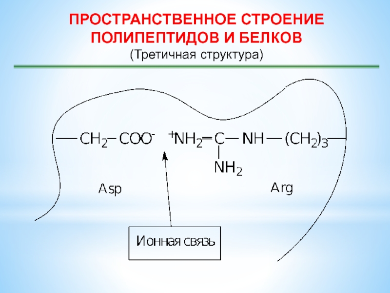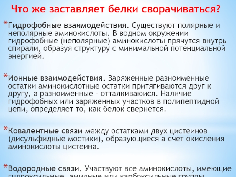 Ионные взаимодействия. Заряженные разноименные остатки аминокислотные остатки притягиваются друг к другу, а разноименные – отталкиваюися. Наличие гидрофобных или заряженных участков в полипептидной цепи, определяет то, как белок свернется.