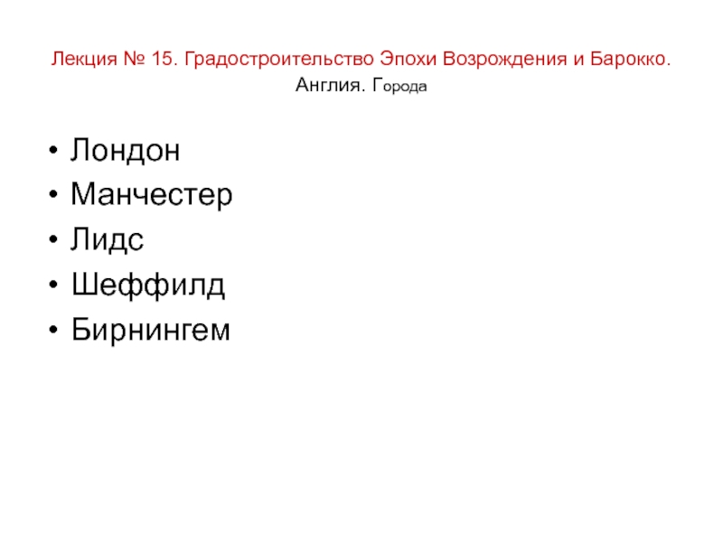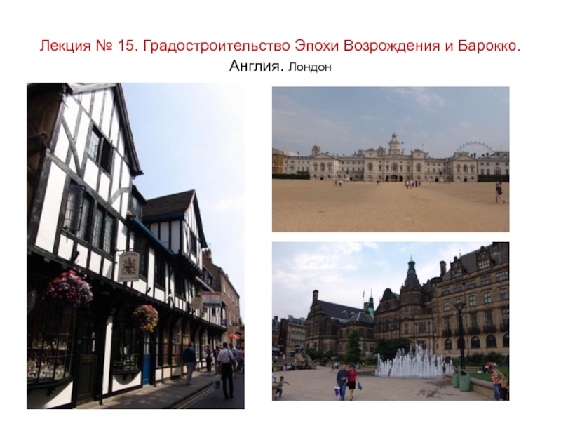 Зарождение капиталистических отношений в Англии. Утопические идеи расселения Томаса Мора и его трактат “Утопия”. Монографический анализ планировочного развития Лондона как основа его реконструкции в Новое время: ансамбли Вестминстера и Лондонского Сити. И. Джонс как градостроитель, ансамбли площадей Ковент-гарден и Линкольн-Инн-Филде. Планировочные предложения по реконструкции Лондона после большого пожара 1666 г. К. Рен и его проект перепланировки Лондонского Сити. Градостроительное значение собора Св. Павла и др. построек К. Рена.