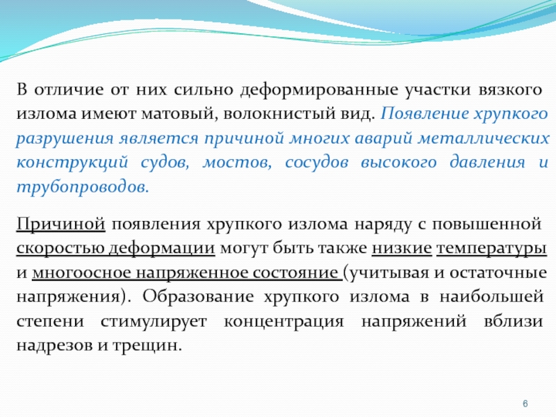 Причиной появления хрупкого излома наряду с повышенной скоростью деформации могут быть также низкие температуры и многоосное напряженное состояние (учитывая и остаточные напряжения). Образование хрупкого излома в наибольшей степени стимулирует концентрация напряжений вблизи надрезов и трещин.