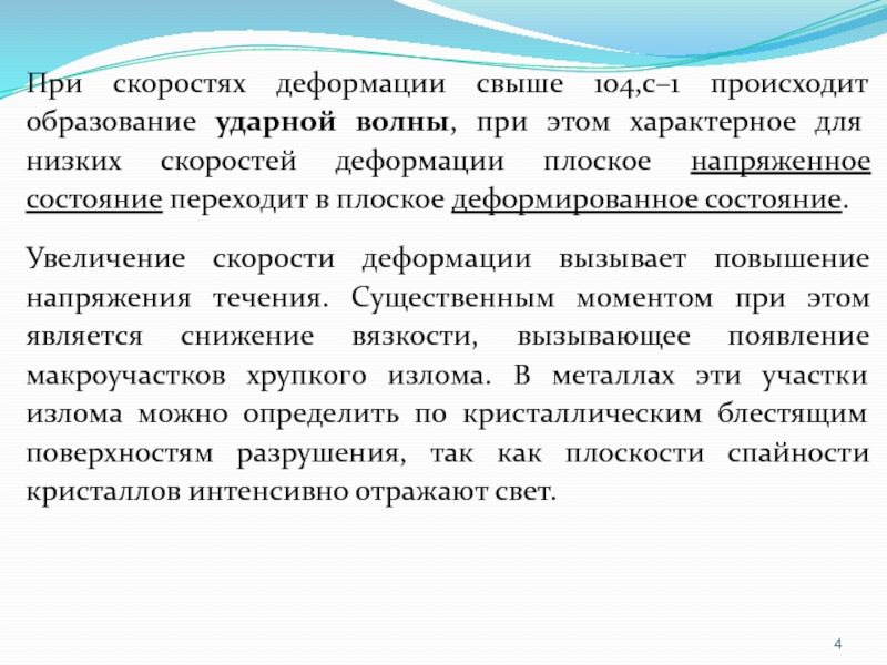 Слайд 4При скоростях деформации свыше 104,с–1 происходит образование ударной волны, при