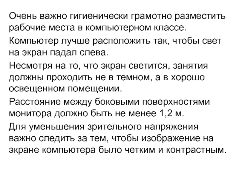 Слайд 8Очень важно гигиенически грамотно разместить рабочие места в компьютерном классе.