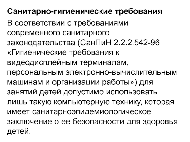 работы») для занятий детей допустимо использовать лишь такую компьютерную технику, которая имеет санитарноэпидемиологическое заключение о ее безопасности для здоровья детей.