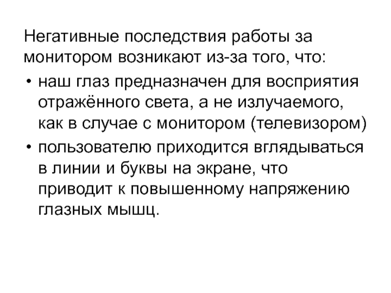 Слайд 18Негативные последствия работы за монитором возникают из-за того, что: