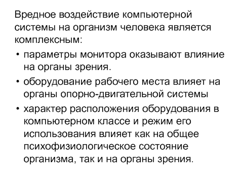 Слайд 20Вредное воздействие компьютерной системы на организм человека является комплексным: