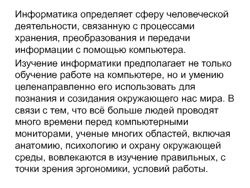 обучение работе на компьютере, но и умению целенаправленно его использовать для познания и созидания окружающего нас мира. В связи с тем, что всё больше людей проводят много времени перед компьютерными мониторами, ученые многих областей, включая анатомию, психологию и охрану окружающей среды, вовлекаются в изучение правильных, с точки зрения эргономики, условий работы.