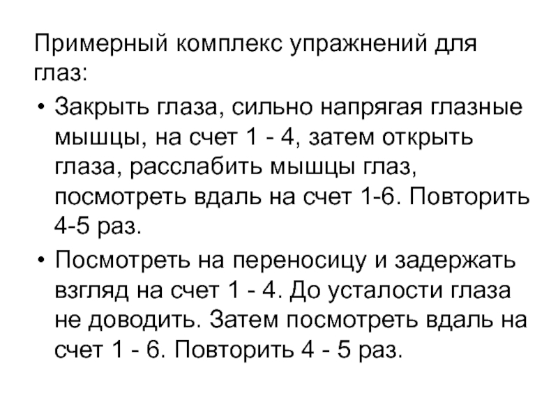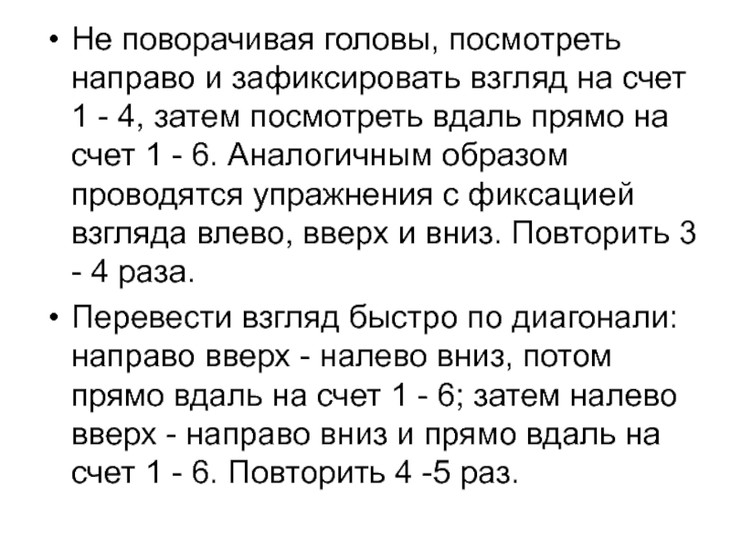 - 6. Аналогичным образом проводятся упражнения с фиксацией взгляда влево, вверх и вниз. Повторить 3 - 4 раза.