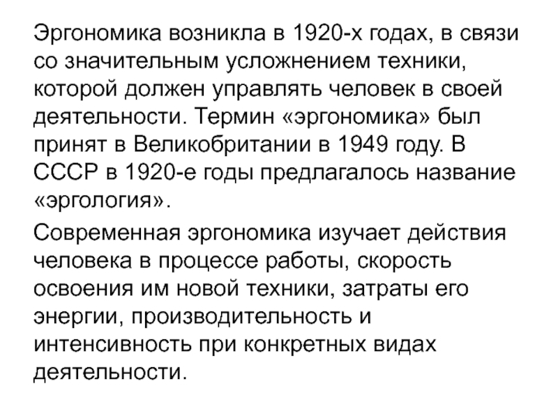 Слайд 4Эргономика возникла в 1920-х годах, в связи со значительным усложнением