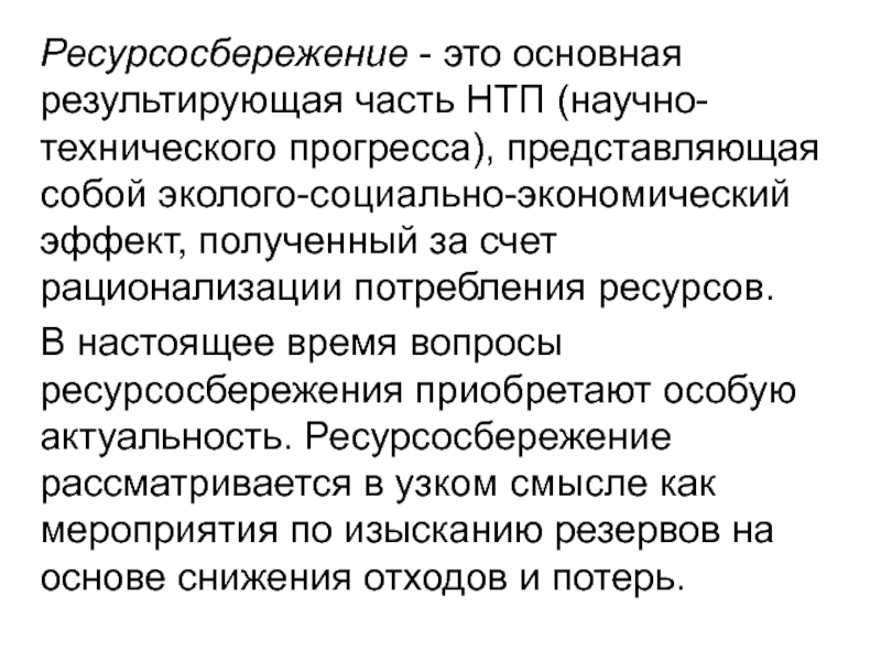 Слайд 23Ресурсосбережение - это основная результирующая часть НТП (научно-технического прогресса), представляющая собой