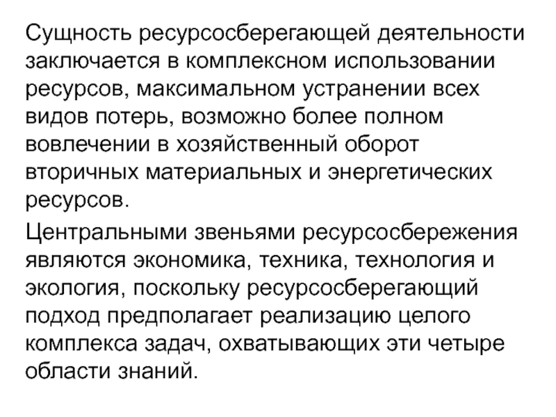 Слайд 24Сущность ресурсосберегающей деятельности заключается в комплексном использовании ресурсов, максимальном устранении