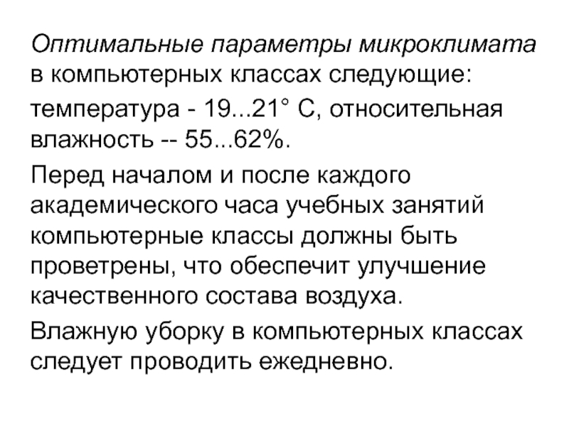 Слайд 10Оптимальные параметры микроклимата в компьютерных классах следующие: