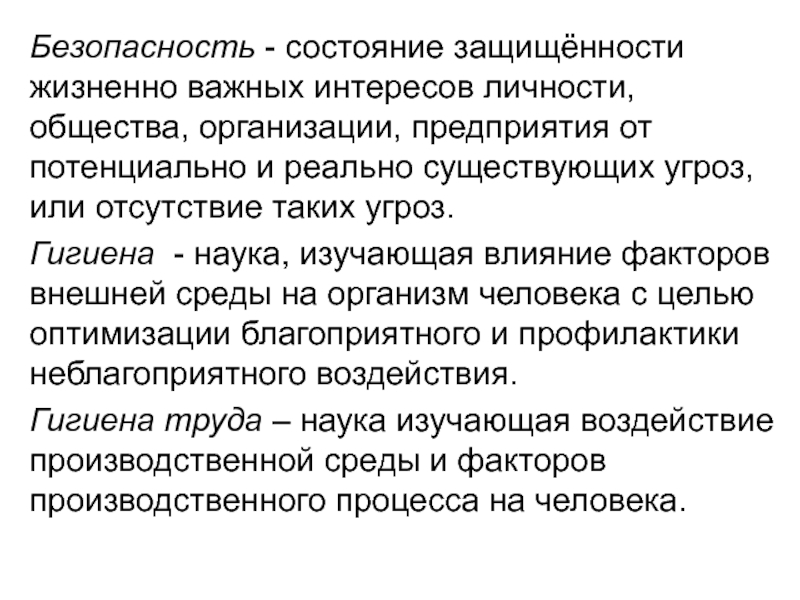 Слайд 2Безопасность - состояние защищённости жизненно важных интересов личности, общества, организации, предприятия от