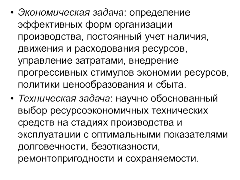 Техническая задача: научно обоснованный выбор ресурсоэкономичных технических средств на стадиях производства и эксплуатации с оптимальными показателями долговечности, безотказности, ремонтопригодности и сохраняемости.