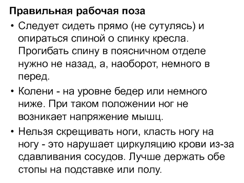 Нельзя скрещивать ноги, класть ногу на ногу - это нарушает циркуляцию крови из-за сдавливания сосудов. Лучше держать обе стопы на подставке или полу.