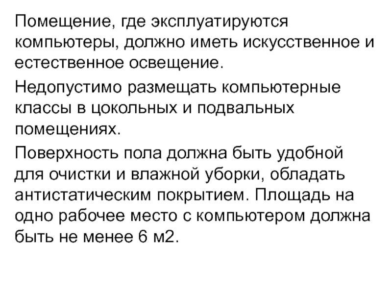 Слайд 7Помещение, где эксплуатируются компьютеры, должно иметь искусственное и естественное освещение.