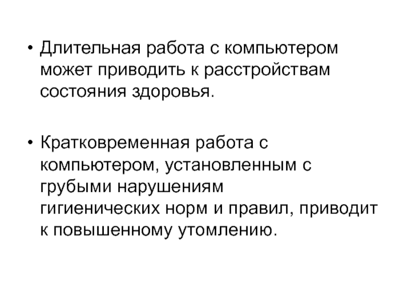 Слайд 19Длительная работа с компьютером может приводить к расстройствам состояния здоровья.