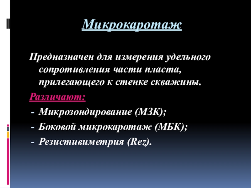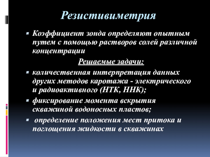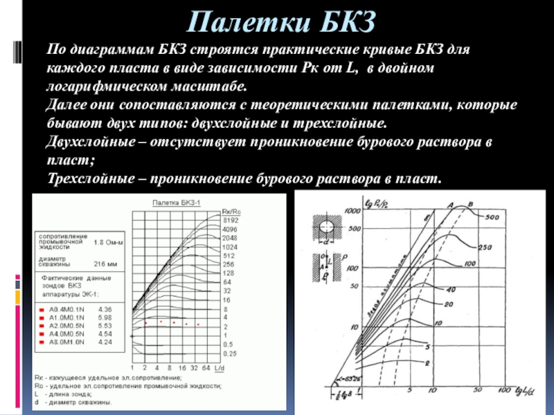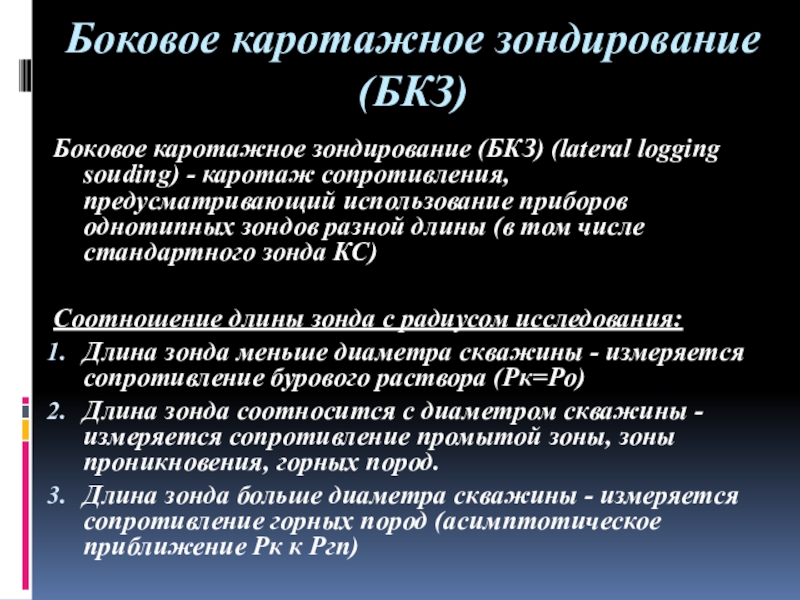 Длина зонда больше диаметра скважины - измеряется сопротивление горных пород (асимптотическое приближение Рк к Ргп)