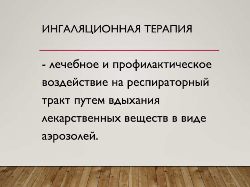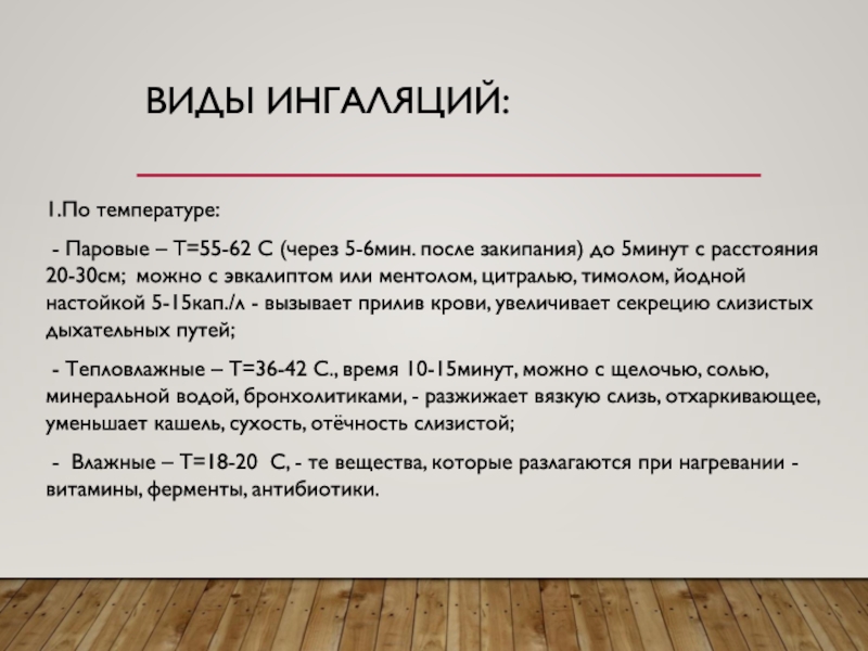 - Тепловлажные – Т=36-42 С., время 10-15минут, можно с щелочью, солью, минеральной водой, бронхолитиками, - разжижает вязкую слизь, отхаркивающее, уменьшает кашель, сухость, отёчность слизистой;