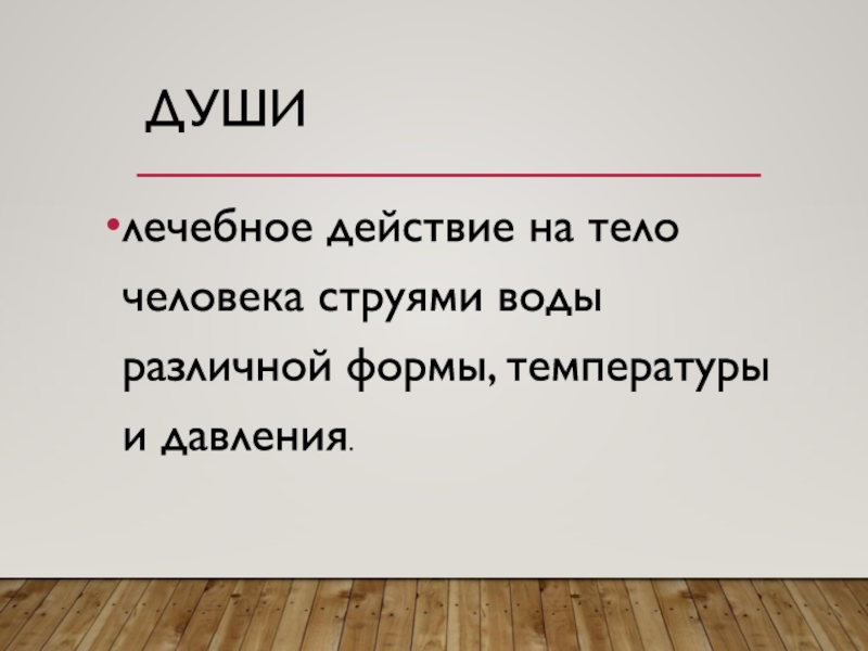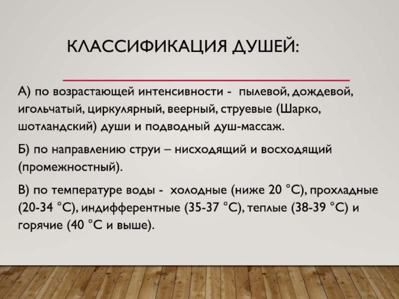 веерный, струевые (Шарко, шотландский) души и подводный душ-массаж.