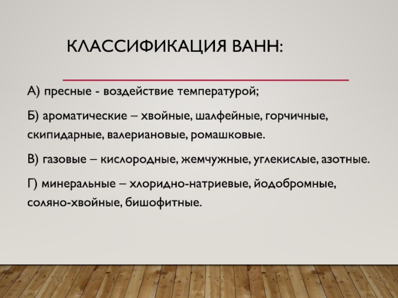 минеральные – хлоридно-натриевые, йодобромные, соляно-хвойные, бишофитные.