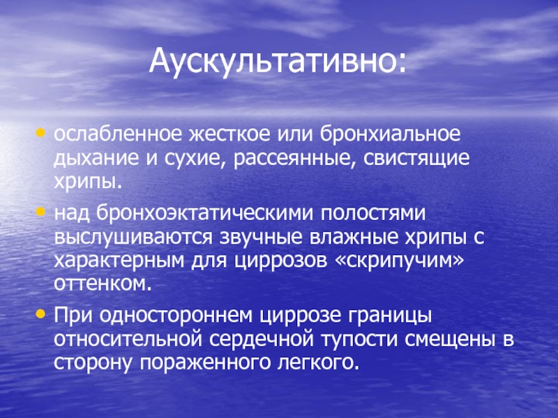 При одностороннем циррозе границы относительной сердечной тупости смещены в сторону пораженного легкого.