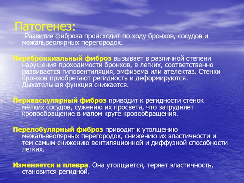 Развитие фиброза происходит по ходу бронхов, сосудов и межальвеолярных перегородок.