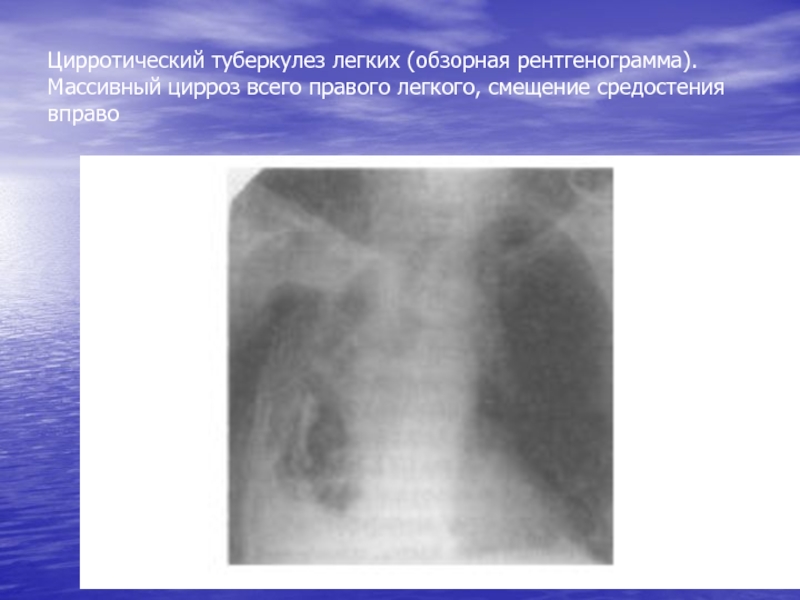 Слайд 59Цирротический туберкулез легких (обзорная рентгенограмма). Массивный цирроз всего правого легкого,