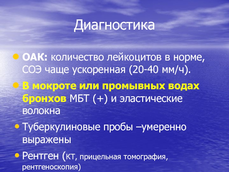 в мокроте, промывных водах бронхов выявляют МБТ и эластические волокна.