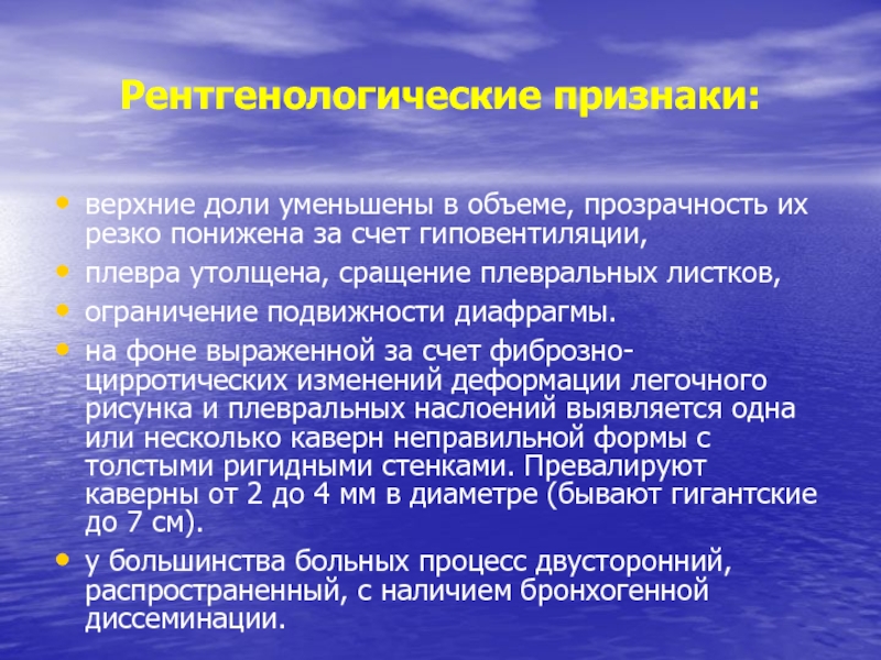 на фоне выраженной за счет фиброзно-цирротических изменений деформации легочного рисунка и плевральных наслоений выявляется одна или несколько каверн неправильной формы с толстыми ригидными стенками. Превалируют каверны от 2 до 4 мм в диаметре (бывают гигантские до 7 см).