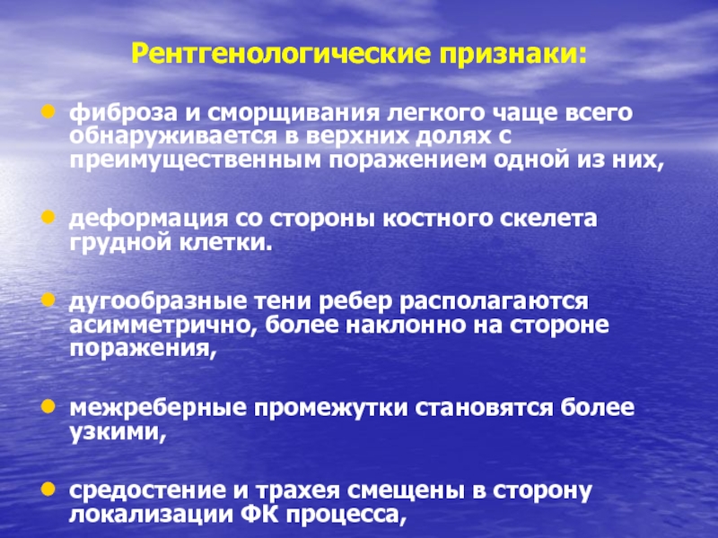 На стороне поражения отмечаются сужение легочного поля, косой ход ребер.