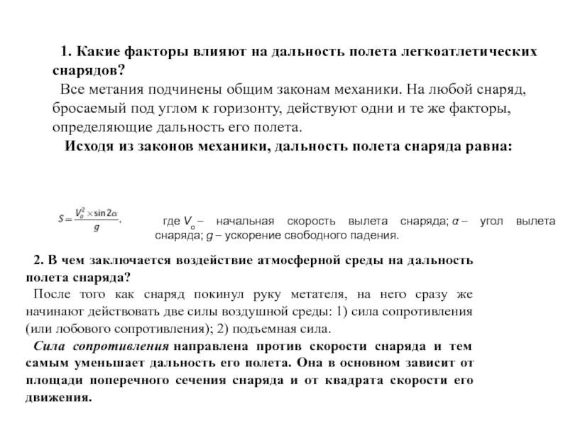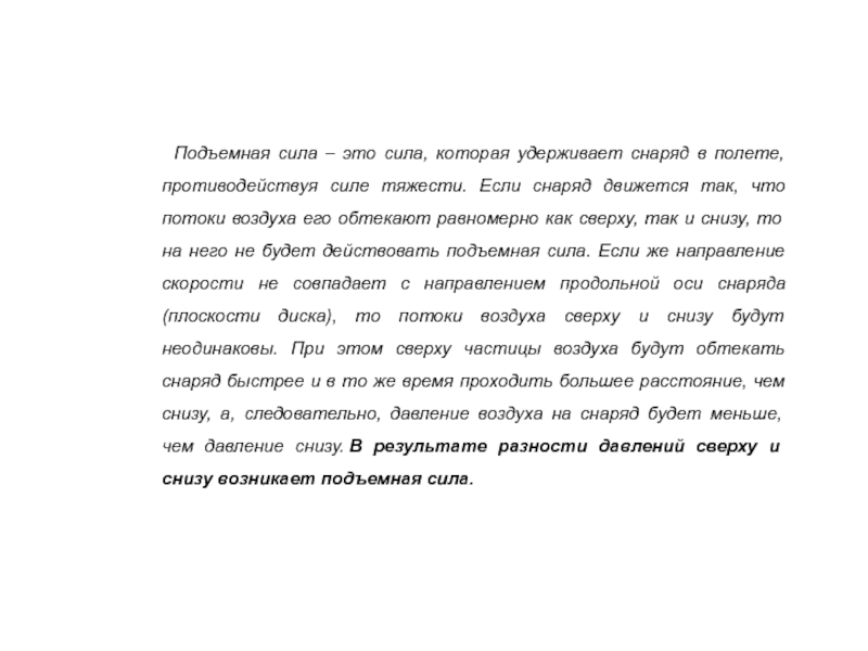 После того как снаряд покинул руку метателя, на него сразу же начинают действовать две силы воздушной среды: 1) сила сопротивления (или лобового сопротивления); 2) подъемная сила.