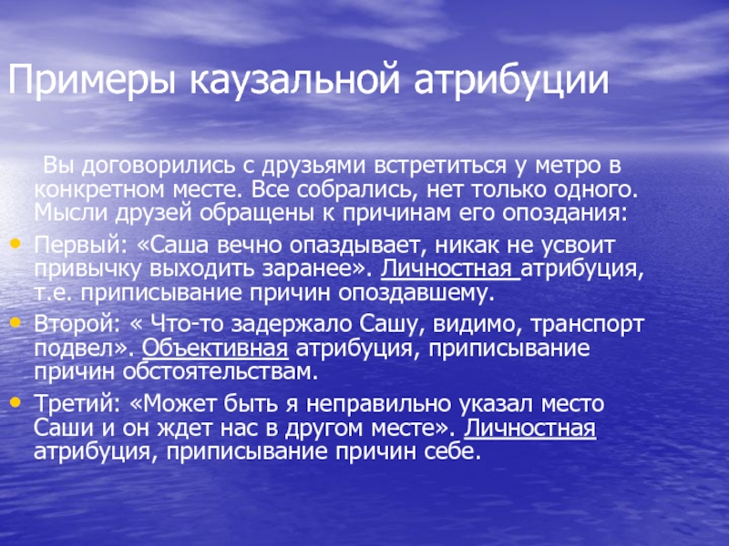 Второй: « Что-то задержало Сашу, видимо, транспорт подвел». Объективная атрибуция, приписывание причин обстоятельствам.