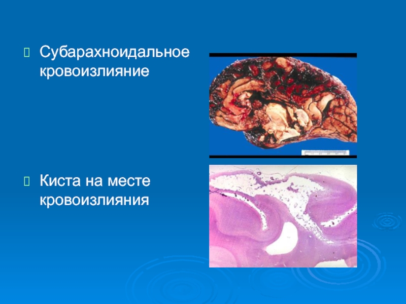Слайд 44Кровоизлияние в головной мозг (гематома), прорыв в боковой желудочек.