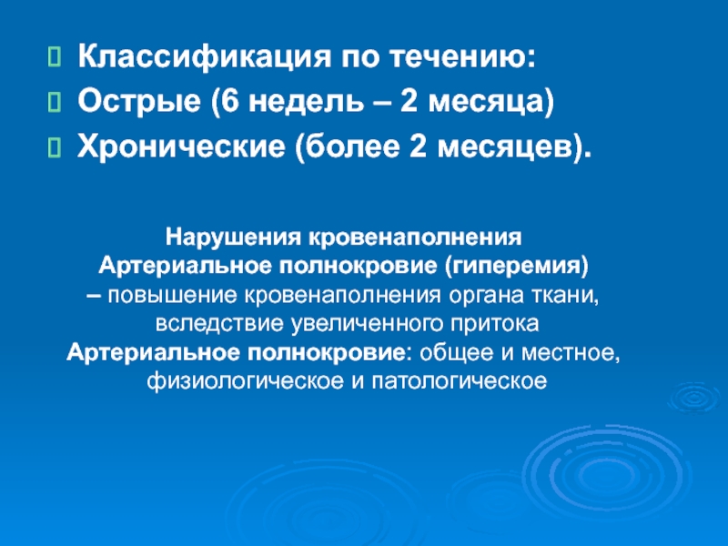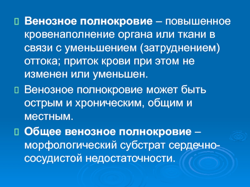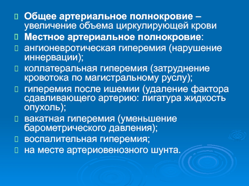Слайд 17Общее артериальное полнокровие – увеличение объема циркулирующей крови